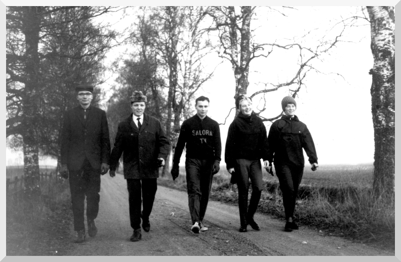 AAMULENKILLÄ MUKANA ERÄÄNÄ MARRASKUISENA SUNNUNTAIAAMUNA 1962 TOISENA VASEMMALTA KAUNO KOSKINEN, KESKELLÄ RAIMO JOKINEN JA OIKEALLA MIRJA LEHTO